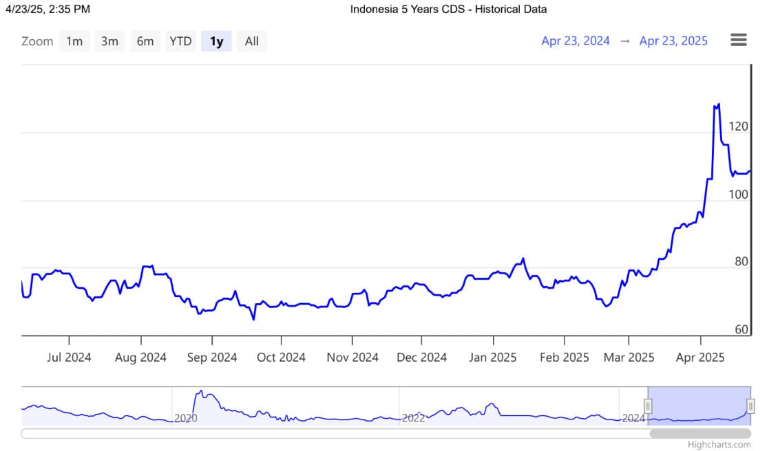 Di sisi lain, upaya pemerintah untuk mendorong konsumsi masyarakat menghadapi tantangan berat dari sisi fiskal. Ini tercermin dari lonjakan Credit Default Swap (CDS) Indonesia tenor lima tahun, yang naik hingga 51,1 persen sejak awal 2025.